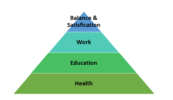 Each step of the system, pictured above as a pyramid, requires the success of the preceding step to function properly. An individual cannot work without good health. An individual can only find balance and satisfaction by working and earning a sufficient income to pay for their necessities (rent, utilities, groceries, transportation, etc.).